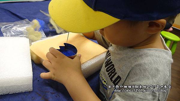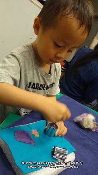 我們就開始了我們的羊毛氈初體驗嚕!!指導的老師提醒,要針的羊毛需取薄薄的一層即可,且先將形狀的外圍給針固定了,再交由小朋友來針中間的部分,但還是要很小心的陪著孩子操作,因為現場幾乎每個孩子都被針到啦@@大寶還一邊針一邊看著別的地方,一直在旁提醒著他「請專心看著你的針和模型」,而小寶也是針到手指的孩子之一><(還好只是個小傷口)