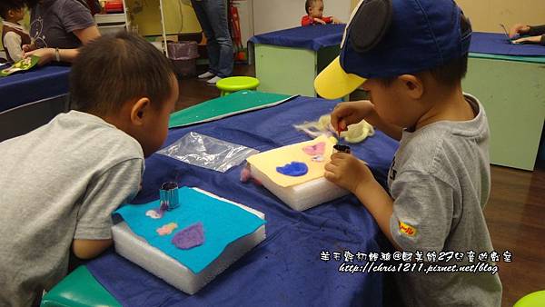 在針的同時,我真的覺得它是項好有趣的技法,而且這樣重複的專注的針,可以讓腦袋放空,而那針的動作讓我覺得有舒解壓力的感覺呢!!!倆寶則是被這項新的勞作遊戲感到好奇且非常有興趣,除了針上單色的圖案外,還玩起了混色。雖然有的圖案針完後並不那麼明顯,且倆寶完全沒有要排版的意思,目標就是把不織布上的每個區塊都針上一個圖案,所以真的有「體驗」的感覺,大部分的孩子都玩一下下就離場了,最後只剩我們這一桌,倆寶玩到工作人員來提醒離場才依依不捨的離開,我想,倆寶一定會不定時就吵著說要再來「做勞作」的。